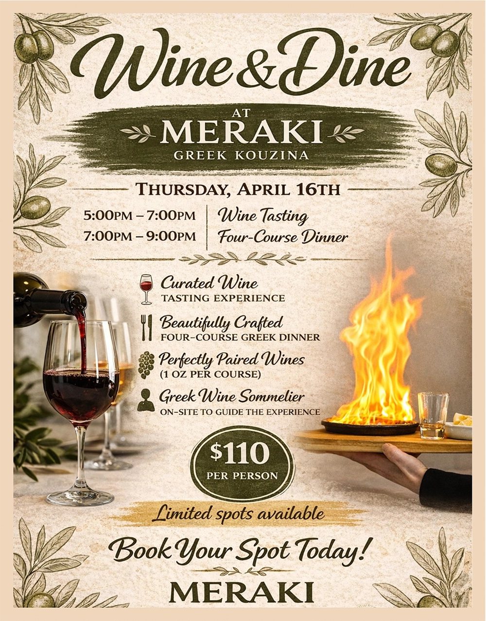 A Greek wine sommelier will be on-site to guide you through each pairing, enhancing your appreciation of the flavors and traditions behind every selection. Priced at $110 per person, this exclusive event offers limited seating, secure your spot today and indulge in an unforgettable night at Meraki.